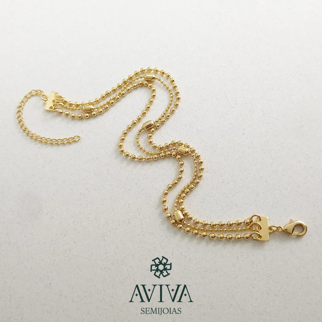 Apresentamos a Pulseira Feminina com Correntes de Bolinhas, uma semijoia de design refinado que exala sofisticação e elegância. Composta por três correntes paralelas de bolinhas, esta peça traz um brilho discreto e um estilo atemporal, perfeito para mulheres que apreciam acessórios delicados e versáteis.